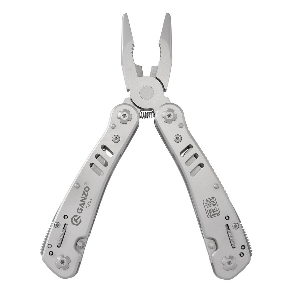 Также в комплект данной модели входит кассета с адаптером и набор разнообразных бит (3 плоских отвертки, 3 крестовых отвертки, 3 шестигранных ключа наиболее популярных размеров). Все инструменты мультитула G301 выполнены из нержавеющей стали 440С. Биты, входящие в комплект, изготовлены из углеродистой стали. Рукоятки мультитула G301 выполнены из нержавеющей стали и имеют структурную поверхность, что способствует уверенному удержанию инструмента во время работы. Для безопасности использования все инструменты модели снабжены фиксирующей защелкой.