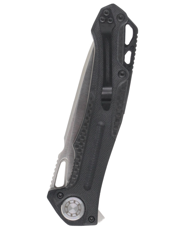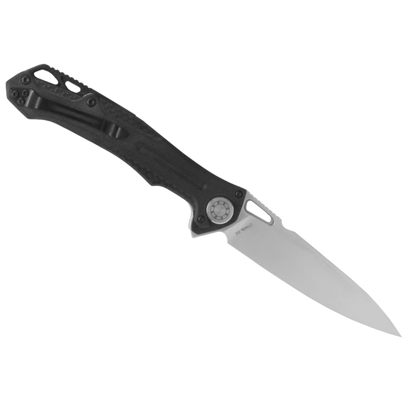 Складной нож Фантом Нокс - продолжение ножей линейки серии Т авторства Александра Бирюкова. Длинный клинок сделан из высокоуглеродистой инструментальной легированной стали Д2. Обратите внимание на его форму, так называемый «тройной клин». Во всех трех проекциях он представляет собой треугольник и это неспроста, подобная геометрия оптимально сочетает отличные режущие свойства и возможность нанести мощный акцентированный укол. «Тройной клин» был проверен и прекрасно зарекомендовал себя на уже получившем широкую известность ноже «Майор». «Фантом» стал развитием идеи, он сам по себе столь же удобен, компактен и маневренен, однако клинок стал длиннее на целый сантиметр! Осевой узел выполнен на подшипниках, благодаря этому нож с легкостью открывается одной рукой двумя способами, по выбору владельца - флиппером или при помощи отверстия на клинке.