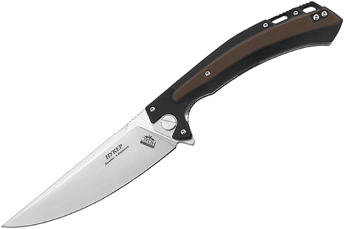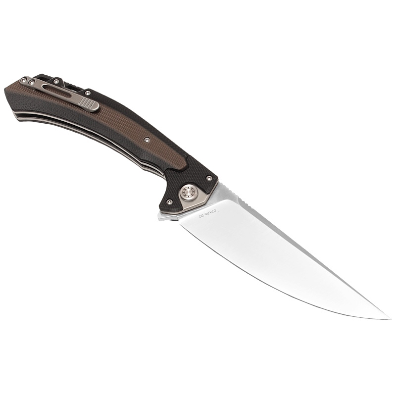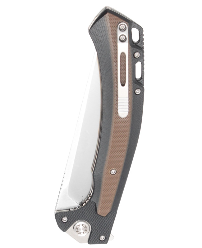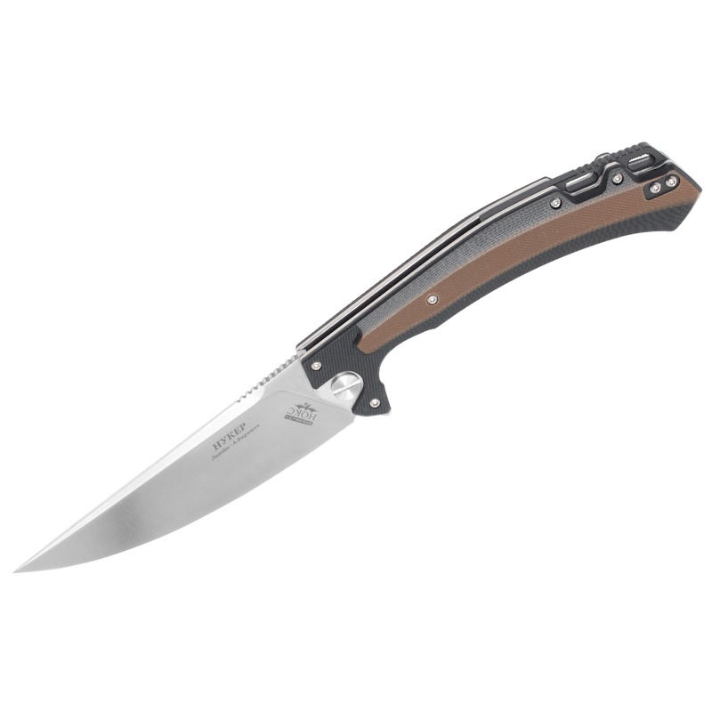 Эргономичная рукоять из прочного материала G10 устойчива к любым воздействиям, прекрасно лежит в ладони, выдерживает существенные нагрузки. Глубокая подпальцевая выемка на её нижней части переходит в развитый упор, и надежно защищает руку от контакта с клинком, который в открытом положении надежно фиксируется замком типа «лайнер-лок».