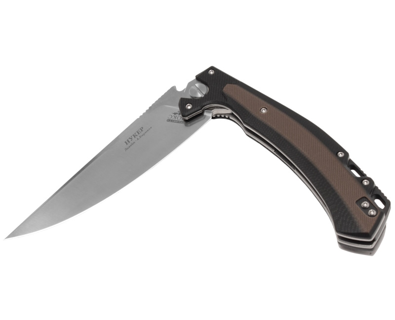 «Нукер» может исполнять роль как ножа «на каждый день», так и походного инструмента. Для комфортного использования на накладках предусмотрена возможность переставлять клипсу на любую сторону по желанию пользователя. Также имеется двойное темлячное отверстие. Осевой узел собран на подшипниках, что способствует мгновенному открывания клинка и приведение его в рабочее положение.