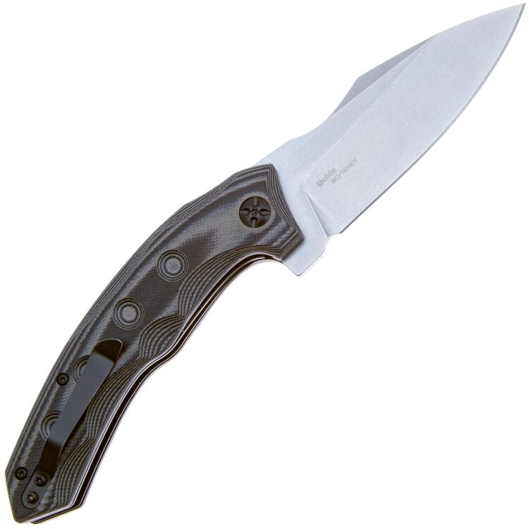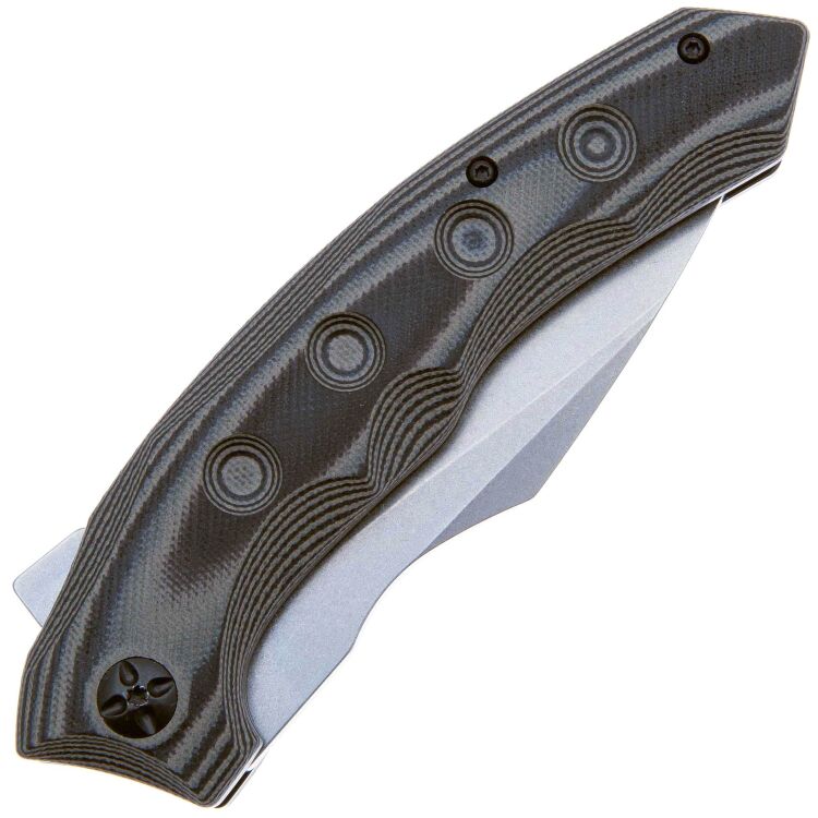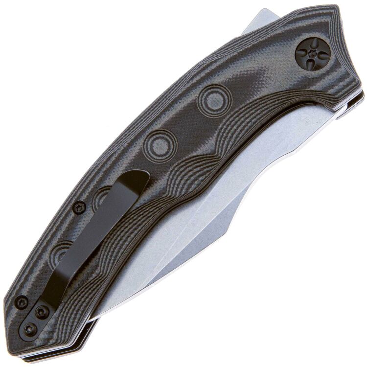 Накладки на лайнерах выполнены из двухцветной микарты, рукоять удобной и безопасной формы, имеются подпальцевые выемки и упор, который не даст руке соскользнуть на режущую кромку. Рукоять ножа оснащена клипсой для ношения в кармане или на ремне.
