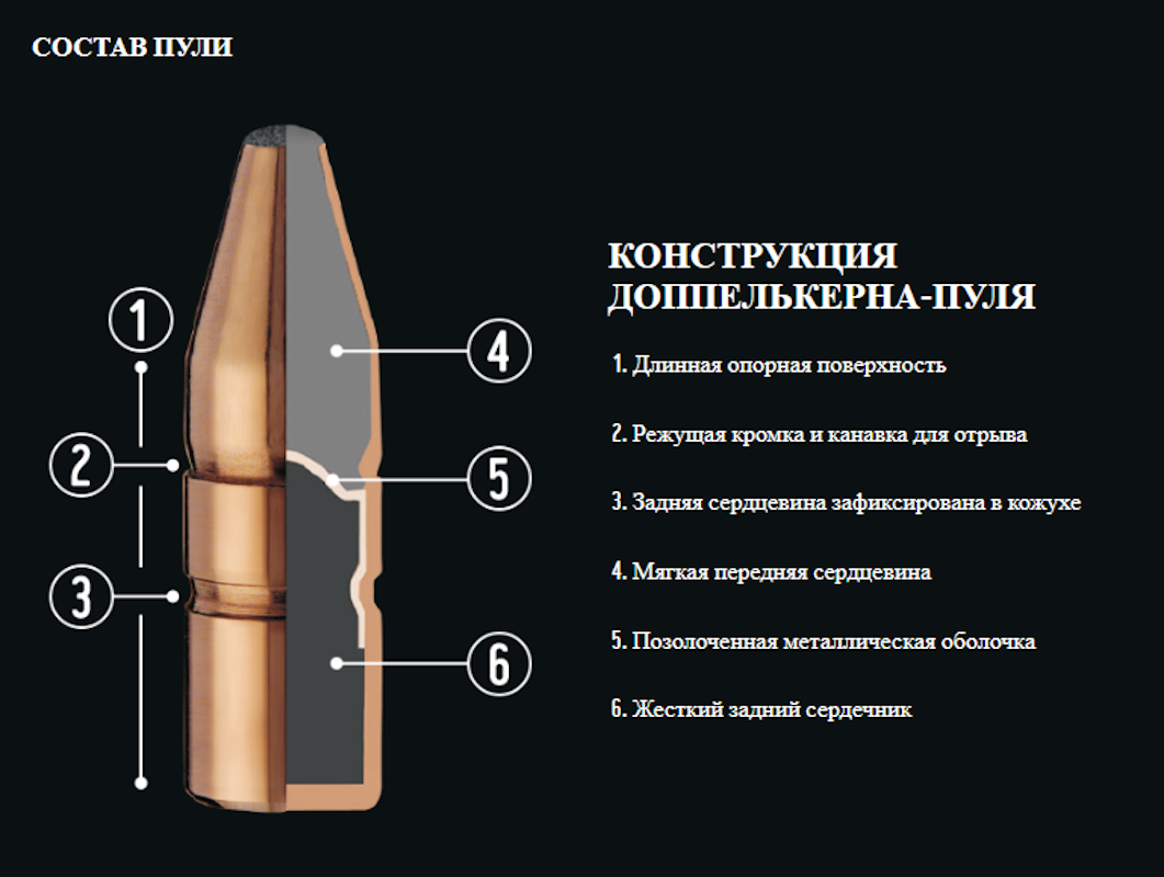 Сердце пули Doppelkern состоит из двух свинцовых сердечников, каждый из которых выполняет свою уникальную функцию. Передний, более мягкий сердечник, предназначен для надежной фрагментации при попадании, обеспечивая мощный удар и мгновенное поражение цели. Задний, более твердый сердечник, защищен уникальным металлическим колпачком, который контролирует деформацию пули и обеспечивает её стабильное проникновение.